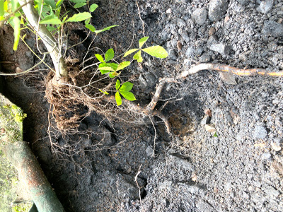 植栽から12年経過した芽苗とポット苗の根の様子です。